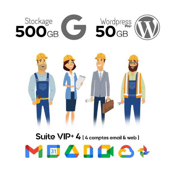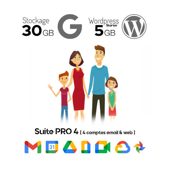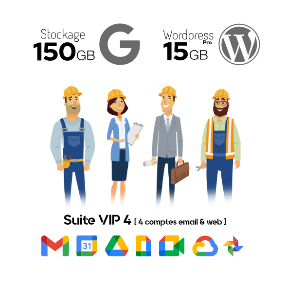 - Quatre comptes Google Workspace incluant quatre emails personalisés @duveau.fr sur la plateforme Gmail. Stockages (15Gb, 30Gb, 150Gb ou 500Gb)